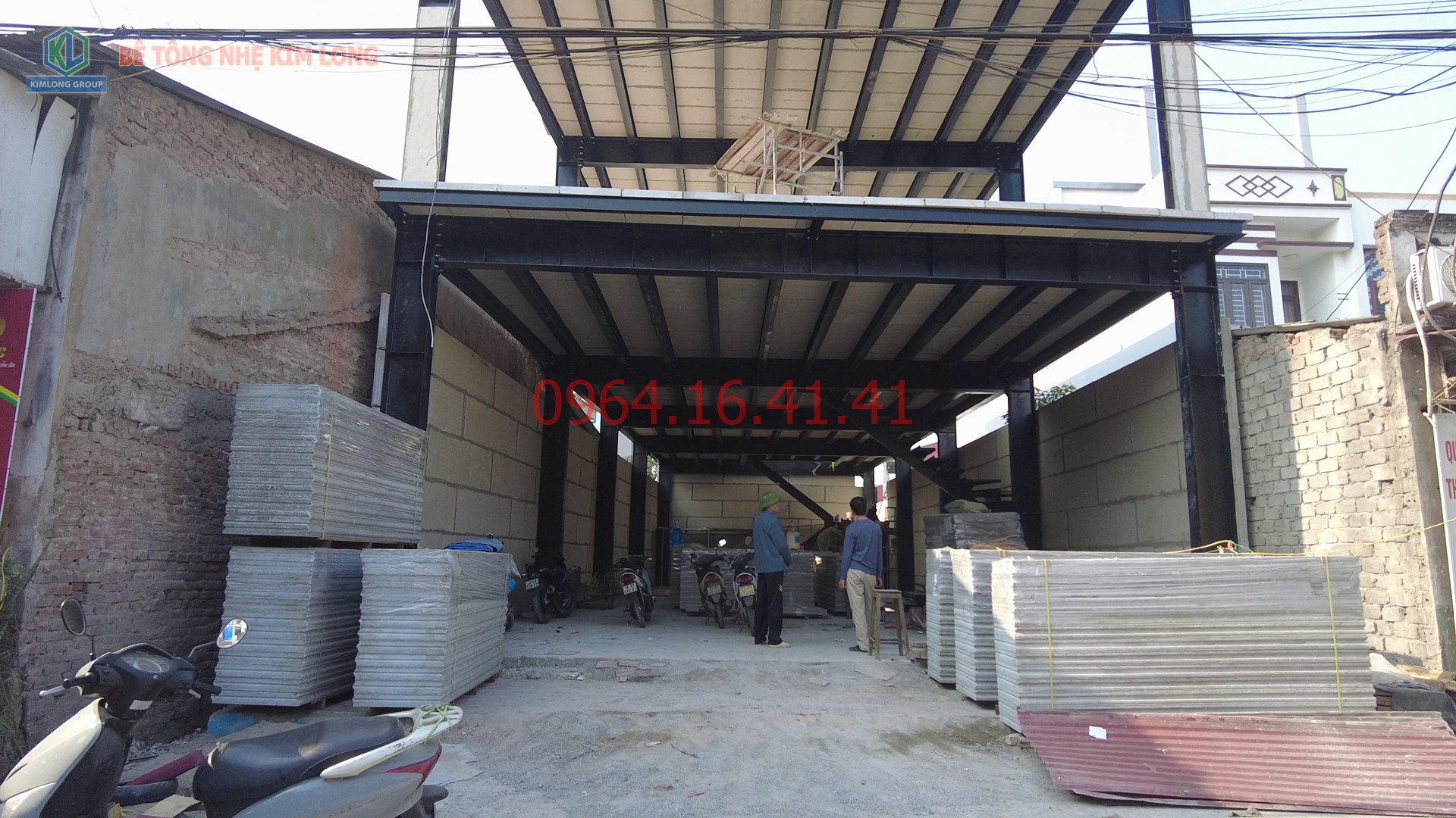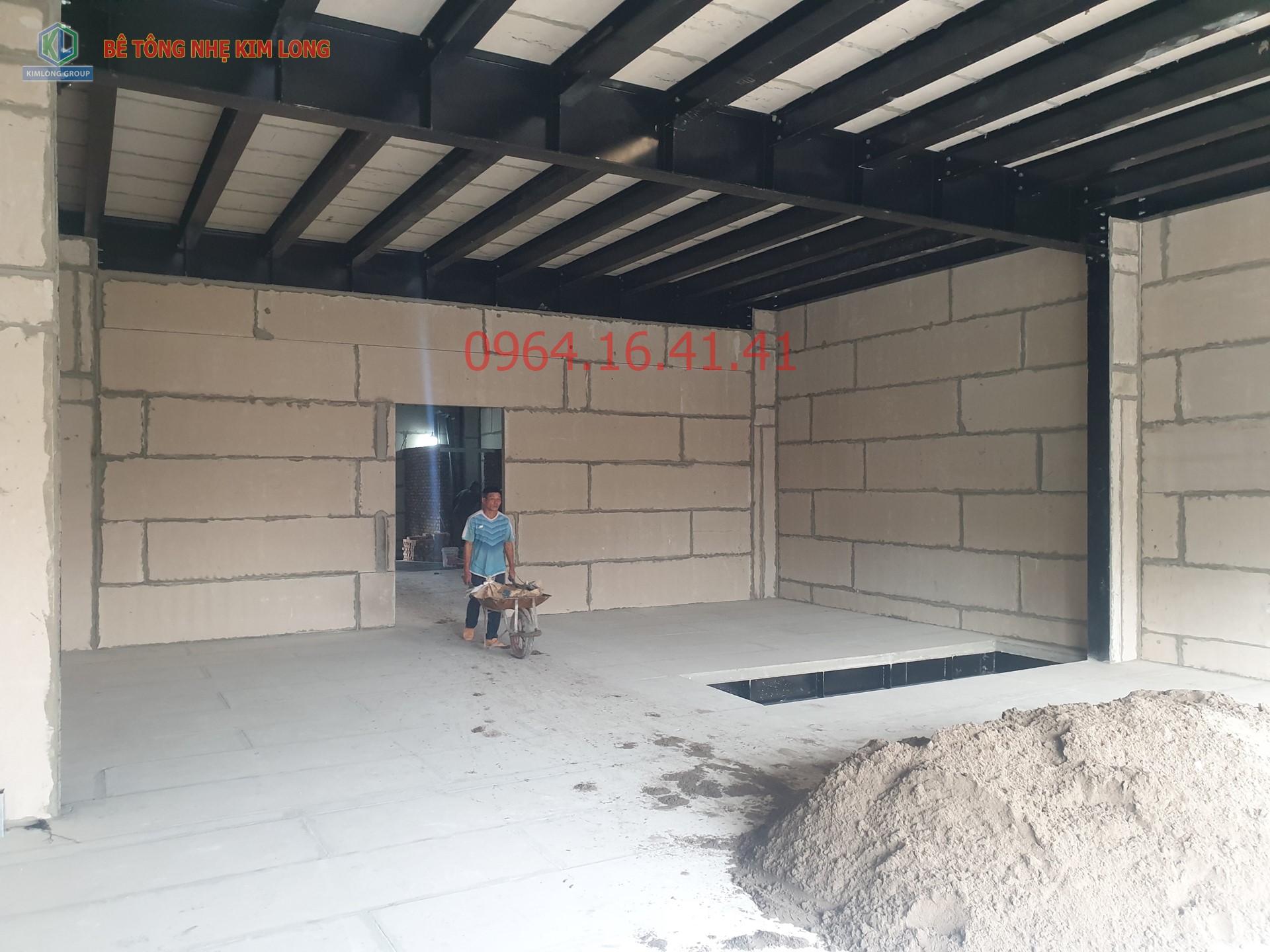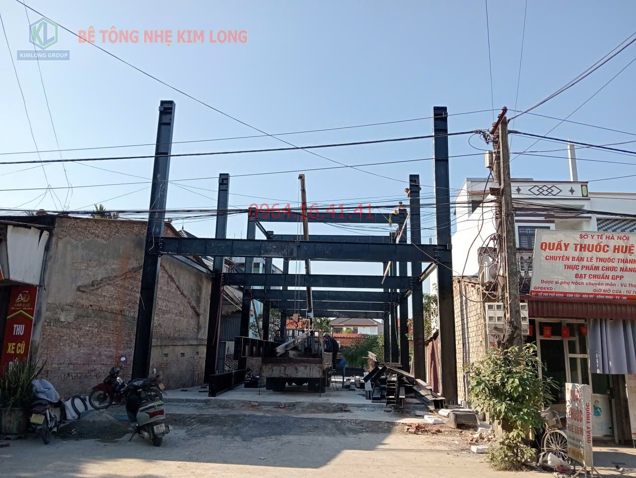 Với quy mô 2 tầng, mỗi tầng 200m2 sàn, gia chủ cần tiến độ thi công nhanh để sớm có mặt bằng kinh doanh, do vậy giải pháp Khung thép kết hợp Bê tông nhẹ Kim Long làm sàn và tường được lựa chọn. Công trình dự kiến hoàn thành trong thời gian 3 tháng tính từ thời điểm động thổ đào móng.