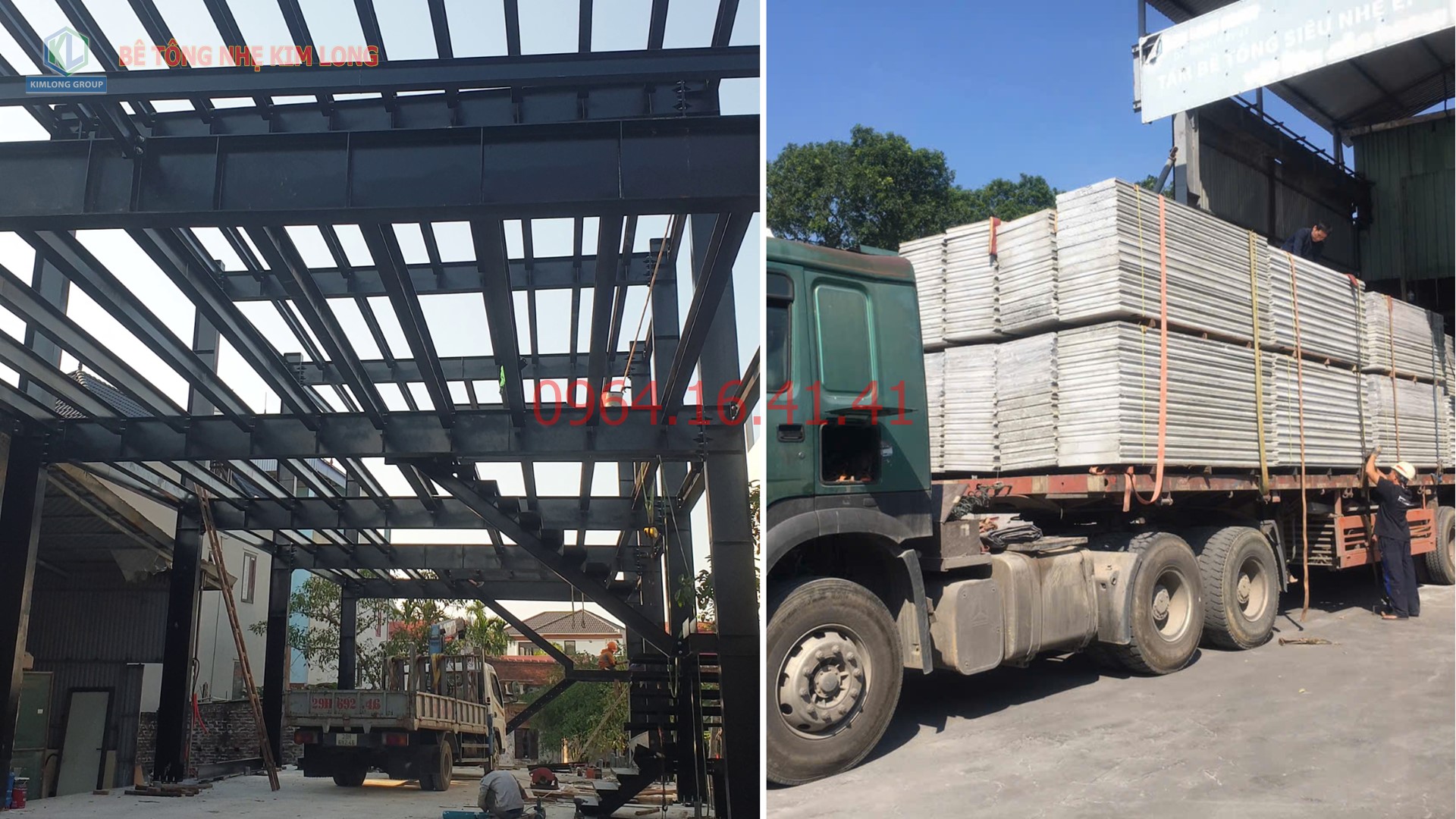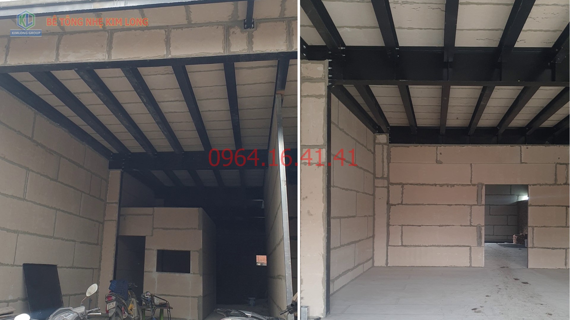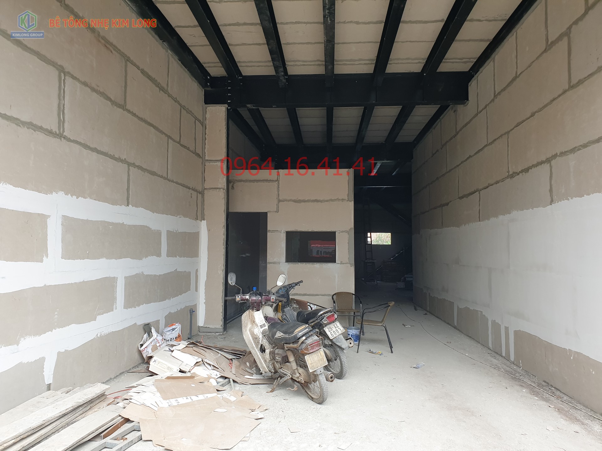 Với quy mô 2 tầng, mỗi tầng 200m2 sàn, gia chủ cần tiến độ thi công nhanh để sớm có mặt bằng kinh doanh, do vậy giải pháp Khung thép kết hợp Bê tông nhẹ Kim Long làm sàn và tường được lựa chọn. Công trình dự kiến hoàn thành trong thời gian 3 tháng tính từ thời điểm động thổ đào móng.